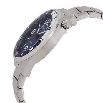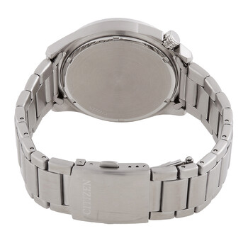 Silver-tone stainless steel case and bracelet. Blue bezel. Blue dial with silver-tone hands and Arabic numeral, index hour markers. Minute markers around the outer rim. Dial Type: Analog. Luminescent hands and markers. Date display at the 3 o'clock position. Citizen Caliber J810 eco-drive movement. Scratch resistant mineral crystal. Screw down crown. Solid case back. Round case shape, case size: 44 mm. Folding clasp. Water resistant at 100 meters / 330 feet. Functions: date, hour, minute, second. Citizen Blue Dial Men's Watch AW1711-87L.