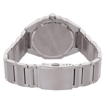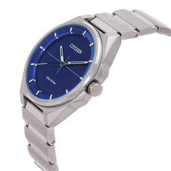 Silver-tone stainless steel case and bracelet. Fixed silver-tone bezel. Blue dial with silver-tone hands and index hour markers. Dial Type: Analog. Citizen Caliber E031 eco-drive movement. Scratch resistant mineral crystal. Round case shape, case size: 41 mm, case thickness: 12 mm. Deployment clasp. Water resistant at 100 meters / 330 feet. Functions: hour, minute, second. Citizen Blue Dial Men's Watch BJ6531-86L.