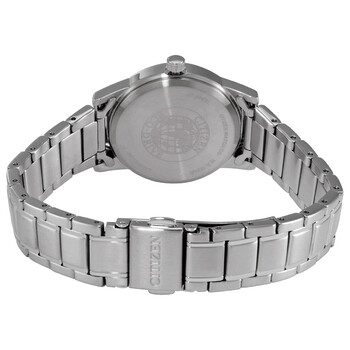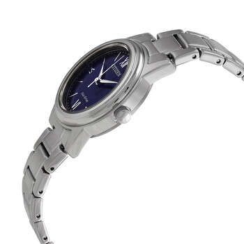 Stainless steel case with a stainless steel bracelet. Fixed stainless steel bezel. Blue dial with silver-tone hands and index hour markers. Roman numerals appear atthe 3, 6, 9 and 12 o'clock positions. Minute markers around the outer rim. Dial Type: Analog. Date display at the 3 o'clock position. Citizen caliber J710 eco-drive movement with a 240-day power reserve. Scratch resistant mineral crystal. Pull / push crown. Solid case back. Round case shape. Case size: 30 mm. Case thickness: 9 mm. Band width: 16 mm. Deployment clasp. Water resistant at 100 meters / 330 feet. Functions: date, hour, minute, second. Casual watch style. Watch label: Japan Movt. Citizen Blue Dial Stainless Steel Ladies Watch FE1220-89L.