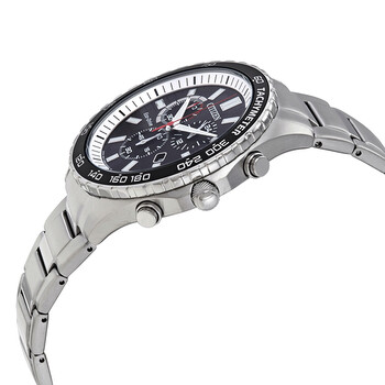 Silver-tone stainless steel case with a silver-tone stainless steel bracelet. Black bezel. Black dial with silver-tone hands and index hour markers. Tachymeter. Dial Type: Analog. Luminescent hands and markers. Date display at the 4 o'clock position. Chronograph - three sub-dials displaying: 60 second, 60 minute and 24 hours. Citizen Caliber Eco-Drive H500 eco-drive movement. Scratch resistant mineral crystal. Solid case back. Round case shape. Case size: 43 mm. Fold over clasp. Water resistant at 100 meters / 330 feet. Functions: chronograph, date, hour, minute, second. Additional Info: powered by light. Sport watch style. Watch label: Japan Movt. Citizen Brycen Chronograph Black Dial Men's Watch AT2380-51E.