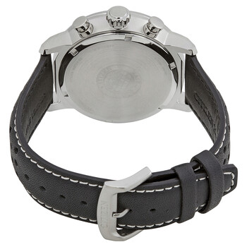 Stainless steel case with a black (perforated) leather strap. Fixed stainless steel bezel with a black aluminum top ring showing tachymeter markings. Black dial with luminous black hands and index hour markers. Arabic numeral minute makers (at 10 minute intervals). Minute markers around the outer rim. Dial Type: Analog. Luminescent hands. Date display at the 3 o'clock position. Chronograph - three sub-dials displaying: 60 second, 60 minute and 24 hours. Citizen caliber Eco-Drive B612 quartz movement. Scratch resistant mineral crystal. Pull / push crown. Solid case back. Round case shape. Case size: 44 mm. Case thickness: 12 mm. Band width: 20 mm. Tang clasp. Water resistant at 100 meters / 330 feet. Functions: chronograph, tachymeter, date, hour, minute, second. Sport watch style. Watch label: Japan Movt. Citizen Brycen Chronograph Black Dial Men's Watch CA0649-14E