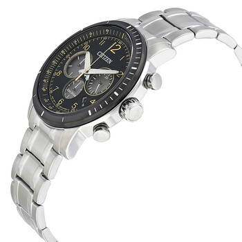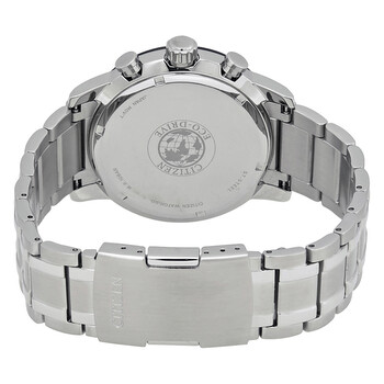 Stainless steel case with a stainless steel bracelet. Fixed black ion-plated bezel. Black dial with luminous silver-tone hands and Arabic numeral hour markers. Minute markers. Tachymeter markings around the outer rim. Dial Type: Analog. Luminescent hands and markers. Date display between the 4 and 5 o'clock positions. Chronograph - three sub-dials displaying: 60 second, 60 minute and 12-24 hours. Citizen caliber Eco-Drive B620 eco-drive movement. Scratch resistant mineral crystal. Solid case back. Round case shape. Case size: 44 mm. Case thickness: 13 mm. Band width: 21 mm. Band length: 9 inches. Deployment clasp with a push button release. Water resistant at 100 meters / 330 feet. Functions: chronograph, tachymeter, date, hour, minute, second. Casual watch style. Watch label: Japan Movt. Citizen Brycen Chronograph Black Dial Men's Watch CA4358-58E.