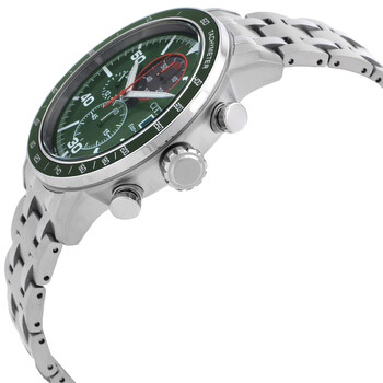 Silver-tone stainless steel case and bracelet. Fixed silver-tone stainless steel bezel with an inlaid green ring. Green dial with silver-tone hands and index hour markers. Minute markers around the outer rim. Dial Type: Analog. Luminescent hands and markers. Date display at the 3 o'clock position. Chronograph - three sub-dials displaying: 60 second, 60 minute and 24 hour. Citizen Caliber Eco-Drive B612 eco-drive movement. Scratch resistant mineral crystal. Solid case back. Round case shape, case size: 44 mm. Band width: 22 mm. Fold over clasp with a safety release. Water resistant at 100 meters / 330 feet. Functions: chronograph, date, hour, minute, second, solar-powered. Brycen Series. Sport watch style. Watch label: Japan Movt. Citizen Brycen Chronograph Eco-Drive Green Dial Men's Watch CA0851-56X.