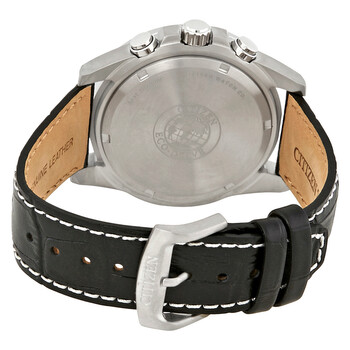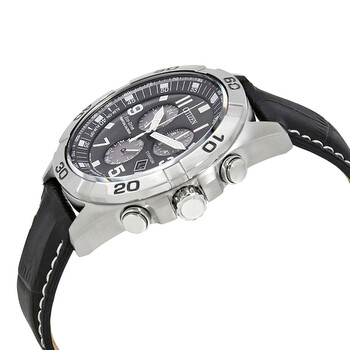 Grey titanium case with a black leather strap. Grey titanium bezel. Dark grey dial with luminous silver-tone hands and alternating index and Arabic numeral hour markers. Minute markers. tachymeter markings around the outer rim. Dial Type: Analog. Luminescent hands and markers. Date display at the 4 o'clock position. Citizen Caliber E820 eco-drive movement. Scratch resistant mineral crystal. Pull / push crown. Solid case back. Round case shape, case size: 43 mm, case thickness: 12 mm. Band width: 20 mm. Tang clasp. Water resistant at 100 meters / 330 feet. Functions: chronograph, date, hour, minute, second, alarm, perpetual calendar; dual time, 12/24 hour time, tachymeter. Casual watch style. Citizen Brycen Perpetual Alarm Chronograph Men's Watch BL5551-14H.