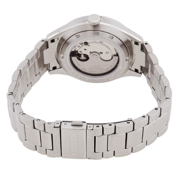 Silver-tone stainless steel case and bracelet. Fixed silver-tone stainless steel bezel. Yellow dial with silver-tone hands and index hour markers. Minute markers around the outer rim. Dial Type: Analog. Date display at the 3 o'clock position. Citizen Caliber 8200 automatic movement. Scratch resistant mineral crystal. Pull / push crown. Transparent case back. Round case shape, case size: 40.2 mm, case thickness: 13.1 mm. Fold over clasp with a safety release. Water resistant at 50 meters / 165 feet. Functions: date, day, hour, minute, second. C7 Series. Dress watch style. Watch label: Japan Movt. Citizen C7 Automatic Yellow Dial Men's Watch NH8391-51Z.