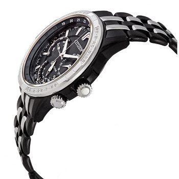 Black ion-plated stainless steel case with a two-tone (silver-tone and black ion-plated) stainless steel bracelet. Fixed stainless steel bezel set with diamonds. Black dial with luminous silver-tone hands and index hour markers. Minute markers. World time ciries. 24 hour markers around the outer rim. Dial Type: Analog. Luminescent hands and markers. Date display at the 3 o'clock position. Three multi-function sub-dials displaying: date, day of the week and 24 hour. Citizen caliber Eco-Drive 8729 eco-drive movement. Scratch resistant mineral crystal. Solid case back. Round case shape. Case size: 44 mm. Case thickness: 13 mm. Band width: 21 mm. Butterfly clasp. Water resistant at 100 meters / 330 feet. Functions: date, day, GMT, second time zone, hour, minute, second, solar-powered. Sport watch style. Watch label: Japan Movt. Additional Information: Featuring Eco-Drive technology – powered by light, any light. Never needs a battery. Citizen Calendrier Diamond Black Dial Men's Watch BU2088-50E.