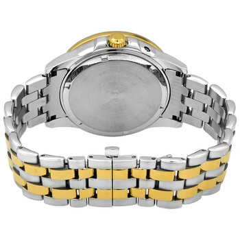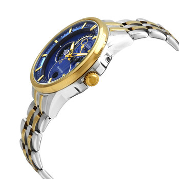 Stainless steel case with a two-tone (silver-tone and gold-tone) stainless steel bracelet. Fixed gold-tone bezel. Blue dial with luminous gold-tone hands and index hour markers. Minute markers around the outer rim. Dial Type: Analog. Luminescent hands. Four multi-function sub-dials displaying: day of the week, date, month and moonphase. Citizen caliber 8730 eco-drive movement. Scratch resistant mineral crystal. Integrated crown. Solid case back. Round case shape. Case size: 44 mm. Case thickness: 13 mm. Band width: 23 mm. Fold over clasp with a push button release. Water resistant at 100 meters / 330 feet. Functions: date, day, month, moonphase, hour, minute, second. Calendrier Series. Casual watch style. Watch label: Japan Movt. Citizen Calendrier Multi-function Blue Dial Two-tone Men's Watch BU0054-52L.
