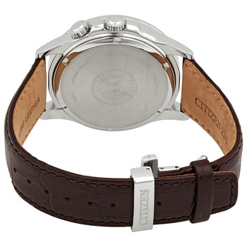 Stainless steel case with a brown leather strap. Fixed stainless steel bezel. Brown dial with luminous silver-tone hands and index hour markers. Minute markers. World time cities. 24 hour markers around the outer rim. Dial Type: Analog. Luminescent hands and markers. Date display at the 3 o'clock position. Three multi-function sub-dials displaying: date, day of the week and 24 hour. Citizen caliber Eco-Drive 8729 eco-drive movement. Scratch resistant mineral crystal. Solid case back. Round case shape. Case size: 44 mm. Case thickness: 13 mm. Band width: 21 mm. Tang clasp. Water resistant at 100 meters / 330 feet. Functions: date, day, GMT, second time zone, hour, minute, second, solar-powered. Additional Info: powered by any light. Dress watch style. Watch label: Japan Movt. Citizen Calendrier World Time Eco-Drive Brown Dial Men's Watch BU2020-29X.