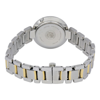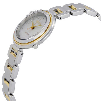 Silver-tone stainless steel case with a two-tone (silver-tone and gold-tone) stainless steel bracelet. Fixed silver-tone and gold-tone bezel. White mother of pearl dial with gold-tone hands. Dial Type: Analog. Citizen caliber Eco-Drive E031 eco-drive movement. Scratch resistant sapphire crystal. Pull / push crown. Solid case back. Round case shape, case size: 28 mm, case thickness: 6/0 mm. Band width: 12.5 mm. Deployment clasp with a push button release. Water resistant at 50 meters / 165 feet. Functions: hour, minute, second. Additional Info: in general, suitable for short periods of recreational swimming, but not diving or snorkeling. Dress watch style. Watch label: Japan Movt. Citizen Carina Mother of Pearl Dial Ladies Watch EM0464-59D.