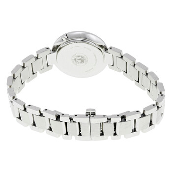 Stainless steel case with a stainless steel bracelet. Fixed stainless steel bezel set with diamonds. Pink mother of pearl diamond-set dial with silver-tone hands. No markers. Dial Type: Analog. Eco-Drive E031 quartz movement. Scratch resistant sapphire crystal. Pull / push crown. Solid case back. Case size: 28 mm. Case thickness: 7 mm. Round case shape. Band width: 12 mm. Deployment clasp with a push button release. Water resistant at 50 meters / 165 feet. Functions: hour, minute, second. Dress watch style. Watch label: Japan Movt. Citizen Carina Pink Mother of Pearl Dial Ladies Watch EM0460-50N.