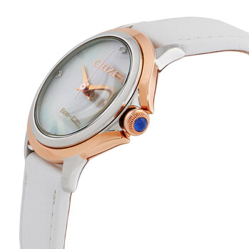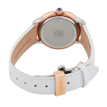 Silver-tone stainless steel case with a white leather strap. Fixed rose gold-tone stainless steel bezel. Mother of pearl dial with rose gold-tone hands and diamond hour markers. Dial Type: Analog. Citizen Caliber Eco-Drive E031 eco-drive movement. Scratch resistant sapphire crystal. Pull / push crown. Solid case back. Round case shape, case size: 32 mm. Deployment clasp. Water resistant at 50 meters / 165 feet. Functions: hour, minute, second, solar-powered. Ceci Series. Dress watch style. Watch label: Japan Movt. Citizen Ceci Eco-Drive Diamond Mother of Pearl Dial Ladies Watch EM0796-08Y.