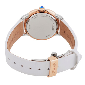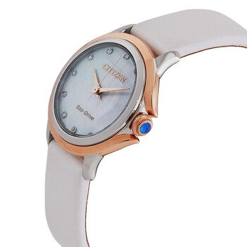 Rose gold-tone stainless steel case with a white leather strap. Fixed gold-tone stainless steel bezel. Mother of pearl dial with rose gold-tone hands and diamond hour markers. Dial Type: Analog. Eco-drive movement. Scratch resistant mineral crystal. Pull / push crown. Solid case back. Round case shape, case size: 32 mm, case thickness: 8 mm. Fold over clasp with a safety release. Water resistant at 50 meters / 165 feet. Functions: hour, minute, second. Ceci Series. Dress watch style. Watch label: Japan Made. Citizen Ceci Eco-Drive Diamond Mother of Pearl Dial Ladies Watch EM0799-00D.