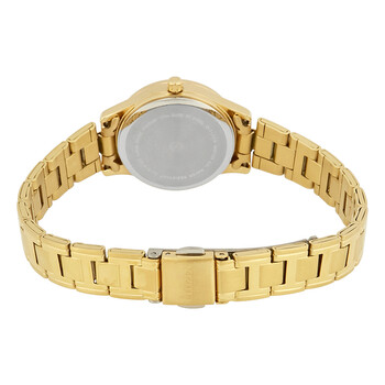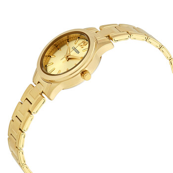 Yellow gold-tone stainless steel case and bracelet. Fixed yellow gold-tone bezel. Champagne dial with luminous yellow gold-tone hands and index hour markers. Arabic numerals appears at the 12 o'clock position. Minute markers around the outer rim. Dial Type: Analog. Luminescent hands and markers. Citizen caliber 1032 quartz movement. Scratch resistant mineral crystal. Pull / push crown. Solid case back. Case size: 25 mm. Case thickness: 8 mm. Round case shape. Band width: 15 mm. Fold over clasp with a push button release. Water resistant at 30 meters / 100 feet. Functions: hour, minute, second. Casual watch style. Watch label: Japan Movt. Citizen Champagne Dial Ladies Watch EL3032-53P.