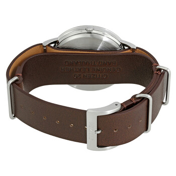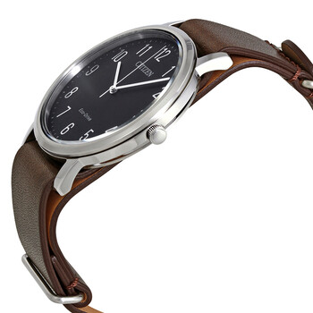 Sstainless steel case with a brown leather nato strap. Fixed stainless steel bezel. Black dial with silver-tone hands and Arabic numeral hour markers. Minute markers around the outer rim. Dial Type: Analog. Citizen caliber Eco-Drive E031 quartz movement. Scratch resistant mineral crystal. Push / pull crown. Solid case back. Case size: 41 mm. Case thickness: 8 mm. Round case shape. Band width: 22 mm. Tang clasp. Water resistant at 50 meters / 165 feet. Functions: hour, minute, second, solar-powered. Casual watch style. Citizen Chandler Black Dial Brown Leather NATO Men's Watch BJ6500-04E.