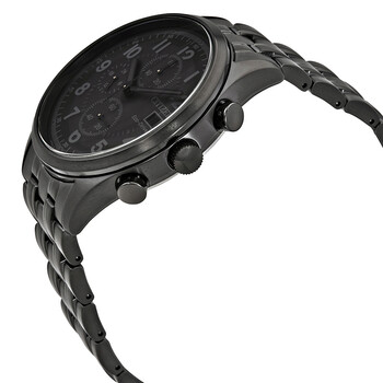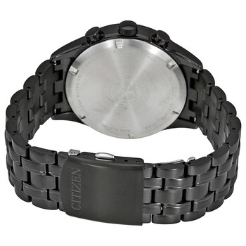 Black ion-plated stainless steel case and bracelet. Fixed black ion-plated bezel. Black dial with luminous black hands and Arabic numeral hour markers. Minute markers around the outer rim. Dial Type: Analog. Luminescent hands and markers. Date display at the 3 o'clock position. Chronograph - three sub-dials displaying: 60 second, 60 minute and 12-24 hours. Citizen caliber Eco-Drive B612 eco-drive movement. Scratch resistant mineral crystal. Pull / push crown. Solid case back. Round case shape. Case size: 42 mm. Case thickness: 12.5 mm. Band width: 22 mm. Deployment clasp with a push button release. Water resistant at 100 meters / 330 feet. Functions: chronograph, date, hour, minute, second. Sport watch style. Watch label: Japan Movt. Citizen Chandler Chronograph Black Dial Men's Watch CA0625-55E.