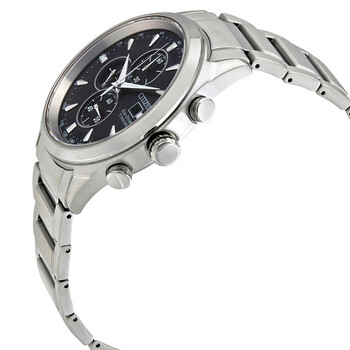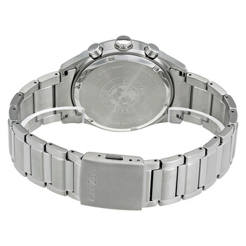 Titanium case with a titanium bracelet. Fixed titanium bezel. Black dial with silver-tone hands and index hour markers. Minute markers. Tachymeter markings around the outer rim. Dial Type: Analog. Luminescent hands and markers. Date display at the 3 o'clock position. Chronograph - three sub-dials displaying: 60 second, 60 minute and 24 hours. Citizen caliber Eco-Drive B612 quartz movement. Scratch resistant sapphire crystal. Pull / push crown. Solid case back. Round case shape. Case size: 43 mm. Case thickness: 17 mm. Band width: 19 mm. Fold over clasp. Water resistant at 100 meters / 330 feet. Functions: chronograph, tachymeter, date, hour, minute, second. Dress watch style. Citizen Chandler Chronograph Black Dial Men's Watch CA0650-58E.