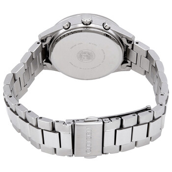 Stainless steel case with a stainless steel bracelet. Fixed stainless steel bezel. Blue dial with silver-tone hands and dot hour markers. Minute markers around the outer rim. Dial Type: Analog. Date display at the 4 o'clock position. Chronograph - three sub-dials displaying: 60 second, 60 minute and 24 hour. Citizen caliber Eco-Drive H504 eco-drive movement. Scratch resistant mineral crystal. Pull / push crown. Solid case back. Round case shape. Case size: 32 mm. Case thickness: 9.3 mm. Band width: 15 mm. Fold over clasp with a push button release. Water resistant at 50 meters / 165 feet. Functions: chronograph, date, GMT, hour, minute, second, solar-powered. Sport watch style. Watch label: Japan Movt. Citizen Chandler Chronograph Blue Dial Ladies Watch FB1440-57L.