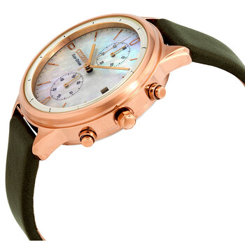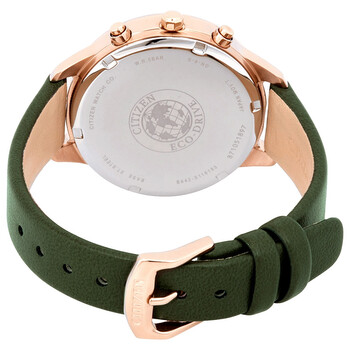 Rose gold-tone stainless steel case with a olive green (vegan) leather strap. Fixed rose gold-tone bezel. Mother of pearl dial with rose gold-tone hands and index hour markers. Minute markers around the outer rim. Dial Type: Analog. Date display at the 3 o'clock position. Chronograph - two sub-dials displaying: 60 second, 60 minute. Citizen caliber B642 eco-drive movement. Scratch resistant mineral crystal. Pull / push crown. Solid case back. Round case shape. Case size: 39 mm. Case thickness: 12 mm. Strap width: 16 mm. Tang clasp. Water resistant at 50 meters / 165 feet. Functions: chronograph, date, hour, minute, small second, solar-powered. Dress watch style. Watch label: Japan Movt. Citizen Chandler Chronograph Mother of Pearl Ladies Watch FB2008-01D.