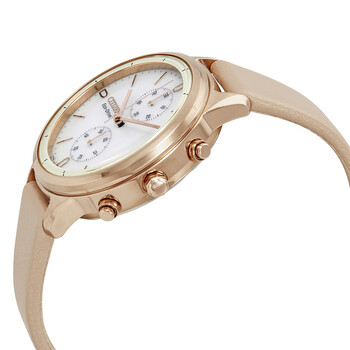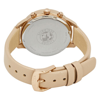 Pink gold ion-plated stainless steel case with a brown (vegan) leather strap. Fixed pink gold ion-plated bezel. White dial with pink gold-tone hands and index hour markers. Dial Type: Analog. Date display at the 3 o'clock position. Chronograph - two sub-dials displaying: 60 second, 60 minute. Citizen caliber B642 eco-drive movement. Scratch resistant mineral crystal. Pull / push crown. Solid case back. Round case shape. Case size: 39 mm. Case thickness: 12 mm. Band width: 16 mm. Tang clasp. Water resistant at 50 meters / 165 feet. Functions: chronograph, date, hour, minute, small second. Sport watch style. Watch label: Japan Movt. Citizen Chandler Chronograph White Dial Ladies Watch FB2003-05A.