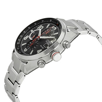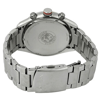 Silver-tone stainless steel case with a silver-tone stainless steel bracelet. Fixed silver-tone stainless steel bezel. Black dial with silver-tone hands and Arabic numeral hour markers. Tachymeter scale around the outer rim. Dial Type: Analog. Luminescent hands and markers. Date display at the 3 o'clock position. Chronograph - three sub-dials displaying: 60 second, 60 minute and 24 hour. Eco-drive movement. Scratch resistant mineral crystal. Pull / push crown. Solid case back. Round case shape, case size: 45 mm, case thickness: 13 mm. Band width: 22 mm. Fold over with safety release clasp. Water resistant at 100 meters / 330 feet. Functions: chronograph, date, hour, minute, second, 24 hour. Casual watch style. Watch label: Japan Movt. Citizen Chandler Eco-Drive Chronograph Black Dial Men's Watch CA0368-56E.