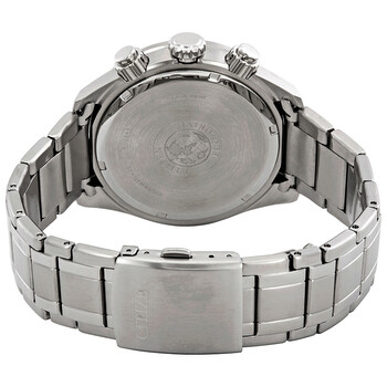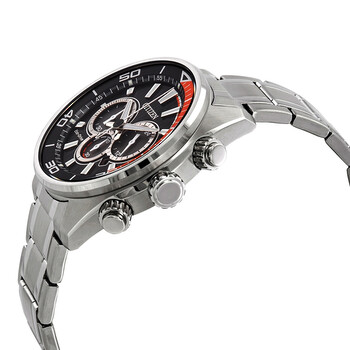 Silver-tone stainless steel case with a silver-tone stainless steel bracelet. Fixed black and orange stainless steel bezel. Black dial with silver-tone hands and index hour markers. Minute markers around the outer rim. Dial Type: Analog. Luminescent hands and markers. Date display between 4 and 5 o'clock position. Chronograph - three sub-dials displaying: 60 second, 60 minute and 24 hour. Citizen Caliber Eco-Drive B620 eco-drive movement. Scratch resistant mineral crystal. Pull / push crown. Solid case back. Round case shape, case size: 45 mm, case thickness: 13 mm. Band width: 20 mm. Fold over with safety release clasp. Water resistant at 100 meters / 330 feet. Functions: chronograph, date, hour, minute, second, solar-powered. Casual watch style. Watch label: Japan Movt. Citizen Chandler Eco-Drive Chronograph Black Dial Men's Watch CA4330-57E.