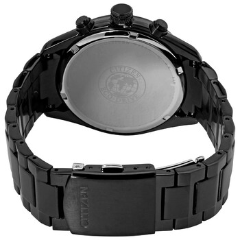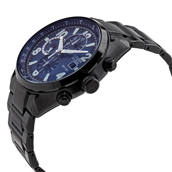 Black ion-plated stainless steel case and bracelet. Fixed black ion-plated bezel. Blue dial with luminous silver-tone hands and Arabic numeral hour markers. Minute markers. Tachymeter markings around the outer rim. Dial Type: Analog. Luminescent hands and markers. Date display at the 3 o'clock position. Chronograph - three sub-dials displaying: 60 second, 60 minute and 24 hour. Eco-drive movement. Scratch resistant mineral crystal. Pull / push crown. Solid case back. Round case shape. Case size: 45 mm. Case thickness: 13 mm. Band width: 22 mm. Fold over clasp with a safety release. Water resistant at 100 meters / 330 feet. Functions: chronograph, tachymeter, date, hour, minute, second, 24 hour. Casual watch style. Watch label: Japan Movt. Citizen Chandler Eco-Drive Chronograph Blue Dial Men's Watch CA0365-54L.