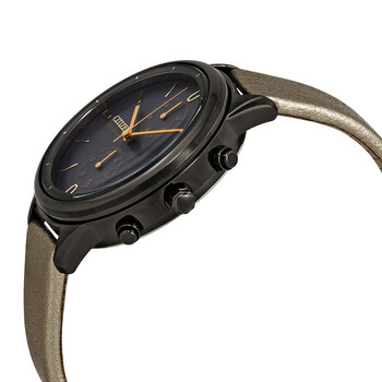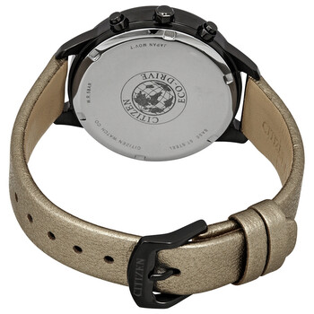 Grey PVD stainless steel case with a gold (vegan) leather strap. Fixed smooth grey PVD bezel. Dark grey dial with rose gold-tone hands and index hour markers. Minute markers around the outer rim. Dial Type: Analog. Date display at the 3 o'clock position. Chronograph - two sub-dials displaying: 60 second and 60 minute. Citizen caliber B642 eco-drive movement. Scratch resistant mineral crystal. Pull / push crown. Solid case back. Round case shape. Case size: 39 mm. Case thickness: 11 mm. Tang clasp. Water resistant at 50 meters / 165 feet. Functions: chronograph, date, hour, minute, second. Additional Info: featuring our eco-drive technology â powered by light, any light. never needs a battery. Chandler Series. Sport watch style. Watch label: Japan Movt. Citizen Chandler Eco-Drive Chronograph Ladies Watch FB2007-04H.
