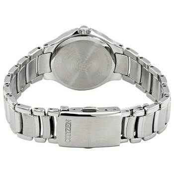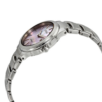 Stainless steel case with a 1 stainless steel bracelet. Fixed stainless steel bezel. Pink mother of pearl dial with luminous silver-tone hands and index hour markers. Minute markers around the outer rim. Dial Type: Analog. Luminescent hands. Date display at the 3 o'clock position. Citizen caliber E013 eco-drive movement. Scratch resistant mineral crystal. Pull / push crown. Solid case back. Round case shape. Case size: 30 mm. Case thickness: 8 mm. Band width: 16 mm. Fold over clasp with a push button release. Water resistant at 50 meters / 165 feet. Functions: date, hour, minute, second. Chandler Series. Casual watch style. Citizen Chandler Eco-Drive Pink Mother of Pearl Dial Ladies Watch EW2520-56Y.