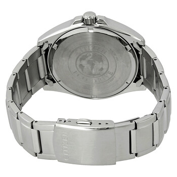 Silver-tone stainless steel case with a silver-tone stainless steel bracelet. Fixed silver-tone stainless steel bezel. Silver-tone dial with black hands and index with Arabic numeral at the 12, 3, 6, 9 o'clock position hour markers. Minute markers around the outer rim. Dial Type: Analog. Luminescent hands. Date display at the 3 o'clock position. Eco-drive movement. Scratch resistant mineral crystal. Pull / push crown. Solid case back. Round case shape, case size: 43 mm, case thickness: 10 mm. Band width: 22 mm. Fold over with push button release clasp. Water resistant at 100 meters / 330 feet. Functions: date, hour, minute, second. Sport watch style. Watch label: Japan Movt. Citizen Chandler Eco-Drive Silver Dial Men's Watch AW1430-86A.