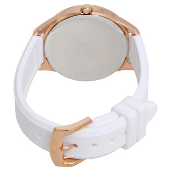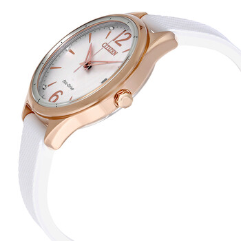 Rose gold-tone stainless steel case with a white silicone strap. Fixed rose gold-tone bezel. Silver dial with luminous rose gold-tone hands and index hour markers. Arabic numerals mark the 6 and 12 o'clock positions. Minute markers around the outer rim. Dial Type: Analog. Luminescent hands and markers. Date display at the 3 o'clock position. Citizen caliber Eco-Drive J810 quartz movement. Scratch resistant mineral crystal. Pull / push crown. Solid case back. Round case shape. Case size: 37 mm. Case thickness: 9 mm. Band width: 16 mm. Band length: 7 inches. Tang clasp. Water resistant at 50 meters / 165 feet. Functions: date, hour, minute, second, solar-powered. Dress watch style. Watch label: Japan Movt. Citizen Chandler Eco-Drive Silver Dial White Silicone Ladies Watch FE6103-00A.