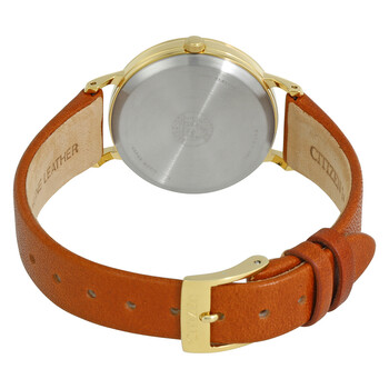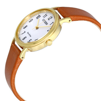 Gold-tone stainless steel case with a brown leather strap. Fixed gold-tone bezel. White dial with gold-tone hands and Arabic numeral hour markers. Minute markers around the outer rim. Dial Type: Analog. Citizen Caliber Eco-Drive E031 movement. Scratch resistant mineral crystal. Push / pull crown. Solid case back. Round case shape. Case size: 30 mm. Case thickness: 7 mm. Band width: 12 mm. Band length: 7 inches. Tang clasp. Water resistant at 50 meters / 165 feet. Functions: hour, minute, second. Casual watch style. Citizen Chandler Eco-Drive White Dial Brown Leather Ladies Watch EM0572-05A.
