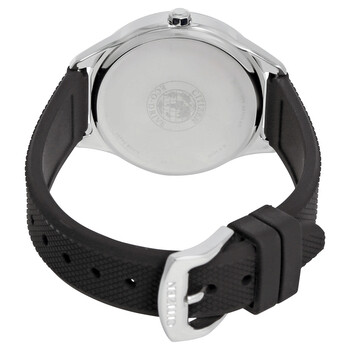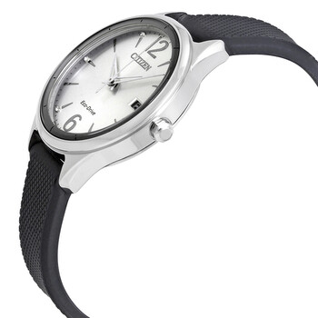 Stainless steel case with a black silicone strap. Fixed stainless steel bezel. Silver dial with luminous silver-tone hands and index hour markers. Arabic numerals mark the 6 and 12 o'clock positions. Minute markers around the outer rim. Dial Type: Analog. Luminescent hands and markers. Date display at the 3 o'clock position. Citizen caliber Eco-Drive J810 quartz movement. Scratch resistant mineral crystal. Pull / push crown. Solid case back. Round case shape. Case size: 37 mm. Case thickness: 9 mm. Band width: 17 mm. Band length: 7 inches. Tang clasp. Water resistant at 50 meters / 165 feet. Functions: date, hour, minute, second. Casual watch style. Watch label: Japan Movt. Citizen Chandler Silver Dial Black Silicone Ladies Watch FE6100-16A.