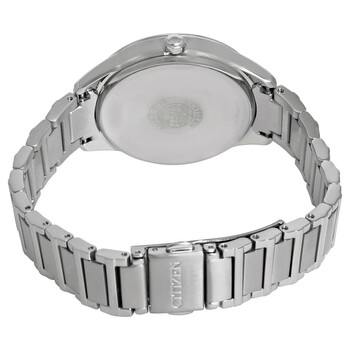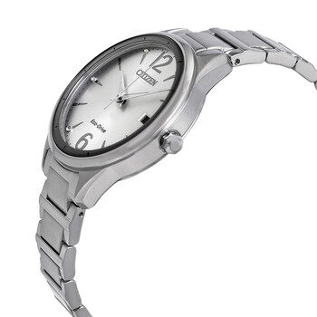Stainless steel case with a stainless steel bracelet. Fixed stainless steel bezel. Silver dial with luminous silver-tone hands and index hour markers. Arabic numerals mark the 6 and 12 o'clock positions. Minute markers around the outer rim. Dial Type: Analog. Luminescent hands and markers. Date display at the 3 o'clock position. Citizen caliber Eco-Drive J810 quartz movement. Scratch resistant mineral crystal. Pull / push crown. Solid case back. Round case shape. Case size: 37 mm. Case thickness: 9 mm. Band width: 17 mm. Band length: 7 inches. Fold over clasp with a push button release. Water resistant at 50 meters / 165 feet. Functions: date, hour, minute, second. Casual watch style. Watch label: Japan Movt. Citizen Chandler Silver Dial Stainless Steel Ladies Watch FE6100-59A.