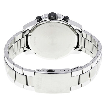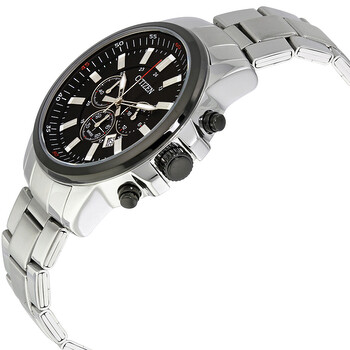 Stainless steel case with a stainless steel bracelet. Fixed black bezel. Black dial with luminous silver-tone hands and index hour markers. Minute markers around the outer rim. Dial Type: Analog. Luminescent hands and markers. Date display between the 4 and 5 o'clock positions. Chronograph - three sub-dials displaying: 60 second, 60 minute and 24 hours. Quartz movement. Scratch resistant mineral crystal. Pull / push crown. Solid case back. Case size: 45 mm. Case thickness: 12 mm. Round case shape. Band width: 20 mm. Fold over clasp with a safety release. Water resistant at 50 meters / 165 feet. Functions: chronograph, date, hour, minute, second, 24hour. Casual watch style. Citizen Chrongraph Black Dial Men's Watch AN8086-53E.