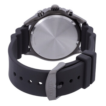 Grey stainless steel case with a black rubber strap. Uni-directional rotating grey stainless steel bezel with a black top ring. Blue dial with black hands and index hour markers. Minute markers around the outer rim. Dial Type: Analog. Luminescent hands and markers. Date display at the 4 o'clock position. Chronograph - three sub-dials displaying: 60 minute, 60 second and 24 hour. Citizen Caliber Eco-Drive H500 eco-drive movement. Scratch resistant mineral crystal. Solid case back. Round case shape, case size: 43 mm, case thickness: 10.7 mm. Band width: 22 mm. Fold over clasp with a safety release. Water resistant at 100 meters / 330 feet. Functions: chronograph, date, hour, minute, second, solar-powered. Chrono Sporty-aqua Series. Sport watch style. Watch label: Japan Movt. Citizen Chrono Sporty-Aqua Chronograph Blue Dial Men's Watch AT2567-18L.