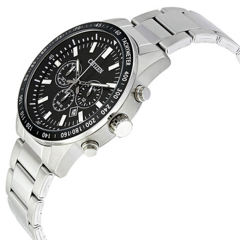 Stainless steel case with a stainless steel bracelet. Fixed stainless steel bezel with a black top ring showing tachymeter markings. Black dial with grey hands and index hour markers. Minute markers around the outer rim. Dial Type: Analog. Luminescent hands and markers. Date display between the 4 and 5 o'clock positions. Chronograph - three sub-dials displaying: 60 second, 60 minute and 24 hours. Quartz movement. Scratch resistant mineral crystal. Pull / push crown. Solid case back. Case size: 44 mm. Case thickness: 12 mm. Round case shape. Band width: 20 mm. Fold over clasp with a safety release. Water resistant at 50 meters / 165 feet. Functions: chronograph, tachymeter, date, hour, minute, second. Casual watch style. Citizen Chronograph Black Dial Men's Watch AN8071-51E.