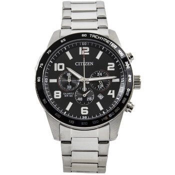 Stainless steel case with a stainless steel bracelet. Fixed black-plated bezel showing tachymeter markings. Black dial with luminous silver-tone hands and alternating Arabic numeral and index hour markers. Minute markers around the outer rim. Dial Type: Analog. Luminescent hands. Date display between the 4 and 5 o'clock positions. Chronograph - three sub-dials displaying: 60 second, 60 minute and 24hour. Citizen caliber 0520 eco-drive movement. Scratch resistant mineral crystal. Screw down crown. Solid case back. Round case shape. Case size: 44 mm. Case thickness: 12 mm. Band width: 22 mm. Deployment clasp. Water resistant at 50 meters / 165 feet. Functions: chronograph, tachymeter, date, hour, minute, second. Casual watch style. Citizen Chronograph Black Dial Men's Watch AN8180-55E.