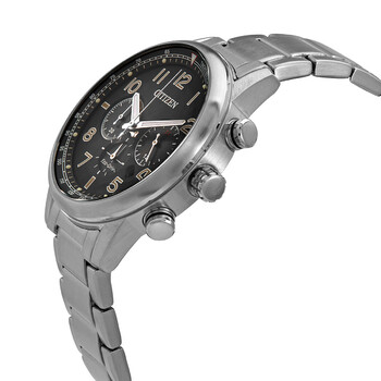 Stainless steel case with a stainless steel bracelet. Fixed stainless steel bezel. Black dial with luminous silver-tone hands and Arabic numeral hour markers. Minute markers. Tachymeter markers around the outer rim. Dial Type: Analog. Luminescent hands. Date display between the 4 and 5 o'clock positions. Citizen caliber B620 eco-drive movement. Scratch resistant mineral crystal. Pull / push crown. Solid case back. Round case shape. Case size: 43 mm. Case thickness: 13 mm. Band width: 20 mm. Fold over clasp with a push button release. Water resistant at 100 meters / 330 feet. Functions: chronograph, tachymeter, date, hour, minute, second. Casual watch style. Citizen Chronograph Black Dial Stainless Steel Men's Watch CA4420-81E.