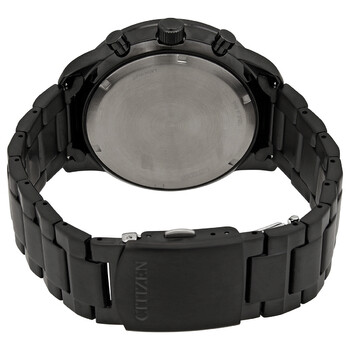 Black-plated stainless steel case and bracelet. Fixed black-plated bezel. Blue dial with luminous silver-tone hands and Arabic numeral hour markers. Minute markers. Arabic numeral minute markers (at 5 minute intervals). Base 30 pulsation markers around the outer rim. Dial Type: Analog. Luminescent hands and markers. Date display between the 4 and 5 o'clock positions. Chronograph - three sub-dials displaying: 60 second, 60 minute and 24 hour. Citizen Caliber B620 eco-drive movement. Scratch resistant mineral crystal. Solid case back. Round case shape. Case size: 44 mm. Deployment clasp. Water resistant at 100 meters / 330 feet. Functions: chronograph, date, hour, minute, second, base 30 pulsations for high accuracy heart rate count. Dress watch style. Watch label: Japan Movt. Citizen Chronograph Blue Dial Eco-Drive Men's Watch CA4505-80M.