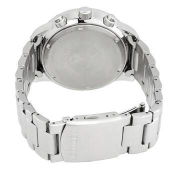 Silver-tone stainless steel case and bracelet. Blue dial with silver-tone, white hands and index hour markers. Compass around the outer rim. Tachymeter scale also on the outer rim. Dial Type: Analog. Luminescent hands and markers. Date display at the 3 o'clock position. Chronograph - three sub-dials displaying: 60 second, 60 minute and12/24 hours. Citizen Caliber B612 eco-drive movement with a 210-day power reserve. Scratch resistant mineral crystal. Pull / push crown. Solid case back. Round case shape, case size: 44 mm, case thickness: 12.5 mm. Deployment with push button release clasp. Water resistant at 100 meters / 330 feet. Functions: chronograph, date, hour, minute, second. Sport watch style. Watch label: Japan Movt. Citizen Chronograph Blue Dial Men's Watch CA0690-88L.