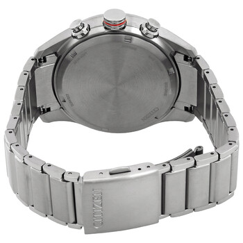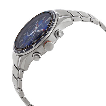 Silver-tone titanium case and bracelet. Blue titanium bezel. Blue dial with silver-tone hands and index hour markers. Tachymeter scale around the outer rim. Dial Type: Analog. Luminescent hands and markers. Date display between 4 and 5 o'clock position. Chronograph - three sub-dials displaying: 60 second, 60 minute and 24 hours. Eco-drive movement. Scratch resistant sapphire crystal. Solid case back. Round case shape, case size: 43 mm, case thickness: 12 mm. Folding clasp. Water resistant at 100 meters / 330 feet. Functions: chronograph, date, hour, minute, second. Sport watch style. Watch label: Japan Movt. Citizen Chronograph Blue Dial Men's Watch CA4490-85L.