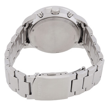 Silver-tone stainless steel case and bracelet. Fixed silver-tone stainless steel bezel. Blue dial with blue hands and index hour markers. Minute markers around the outer rim. Dial Type: Analog. Luminescent hands and markers. Date display between 4 and 5 o'clock position. Chronograph - three sub-dials displaying: 60 second, 60 minute and 24 hour. Citizen Caliber Eco-Drive B620 eco-drive movement. Scratch resistant mineral crystal. Solid case back. Round case shape, case size: 44 mm, case thickness: 13 mm. Fold over clasp with a safety release. Water resistant at 100 meters / 330 feet. Functions: chronograph, date, hour, minute, second, solar-powered. Sport watch style. Watch label: Japan Movt. Citizen Chronograph Blue Dial Men's Watch CA4500-83M.