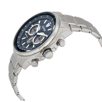 Silver-tone stainless steel case and bracelet. Fixed silver-tone stainless steel bezel. Blue dial with white hands and index hour markers. Minute markers around the inner rim. Tachymeter around the outer rim. Dial Type: Analog. Chronograph - three sub-dials displaying: 60 second, 60 minute and 24 hour. Citizen Caliber Eco-Drive B620 eco-drive movement. Scratch resistant mineral crystal. Pull / push crown. Solid case back. Round case shape, case size: 44 mm, case thickness: 12 mm. Deployment with push button release clasp. Water resistant at 100 meters / 330 feet. Functions: chronograph, date, hour, minute, second, solar-powered. Sport watch style. Watch label: Japan Movt. Citizen Chronograph Blue Dial Men's Watch CA4560-81L.