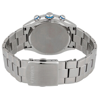 Stainless steel case with a stainless steel bracelet. Fixed stainless steel bezel. Blue dial with luminous silver-tone hands and index hour markers. Minute markers around the outer rim. Dial Type: Analog. Luminescent hands and markers. Date display at the 3 o'clock position. Chronograph - three sub-dials displaying: 60 second, 60 minute and 24 hour. Citizen caliber B612 eco-drive movement. Scratch resistant mineral crystal. Pull / push crown. Solid case back. Round case shape. Case size: 41 mm. Case thickness: 11 mm. Band width: 22 mm. Fold over clasp with a push button release. Water resistant at 100 meters / 330 feet. Functions: chronograph, date, hour, minute, second. Drive Series. Casual watch style. Watch label: Japan Movt. Citizen Chronograph Blue Dial Stainless Steel Men's Watch CA0430-54M.