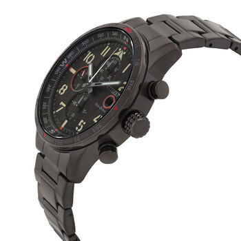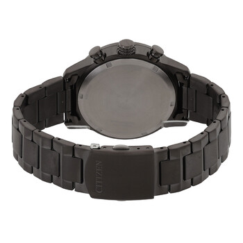 Black stainless steel case and bracelet. Fixed black stainless steel bezel. Black dial with black hands and index-Arabic numeral hour markers. Minute scale around the inner rim. Dial Type: Analog. Luminescent hands and markers. Date display at the 3 o'clock position. Chronograph - three sub-dials displaying: 60 second, 60 minute and 24 hour. Citizen Caliber Eco-Drive B612 eco-drive movement. Scratch resistant mineral crystal. Pull / push crown. Solid case back. Round case shape, case size: 43 mm, case thickness: 13 mm. Band width: 21 mm. Fold over clasp with a safety release. Water resistant at 100 meters / 330 feet. Functions: chronograph, date, hour, minute, second, solar-powered. Sport watch style. Watch label: Japan Movt. Citizen Chronograph Eco-Drive Black Dial Men's Watch CA0797-50E.