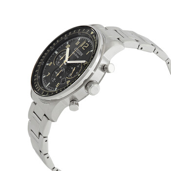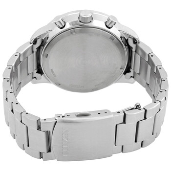 Stainless steel case with a stainless steel bracelet. Fixed stainless steel bezel. Black dial with luminous silver-tone hands and Arabic numeral hour markers. Minute markers. Arabic numeral minute markers (at 5 minute intervals). Base 30 pulsation markers around the outer rim. Dial Type: Analog. Luminescent hands. Date display between the 4 and 5 o'clock positions. Citizen caliber B620 eco-drive movement. Scratch resistant mineral crystal. Pull / push crown. Solid case back. Round case shape. Case size: 44 mm. Case thickness: 13 mm. Band width: 20 mm. Fold over clasp with a push button release. Water resistant at 100 meters / 330 feet. Functions: chronograph, date, hour, minute, second, base 30 pulsations. Eco-drive Series. Casual watch style. Watch label: Japan Movt. Citizen Chronograph Eco-Drive Black Dial Men's Watch CA4500-83E.
