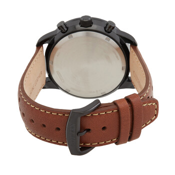 Black-plated stainless steel case with a brown leather strap. Fixed black-plated bezel. Black dial with luminous silver-tone hands and Arabic numeral hour markers. Minute markers. Arabic numeral minute markers (at 5 minute intervals). Base 30 pulsation markers around the outer rim. Dial Type: Analog. Luminescent hands. Date display between the 4 and 5 o'clock positions. Chronograph - three sub-dials displaying: 60 second, 60 minute and 24 hour. Citizen caliber B620 eco-drive movement. Scratch resistant mineral crystal. Pull / push crown. Solid case back. Round case shape. Case size: 44 mm. Case thickness: 13 mm. Band width: 20 mm. Tang clasp. Water resistant at 100 meters / 330 feet. Functions: chronograph, date, hour, minute, second, base 30 pulsations. Eco-drive Series. Casual watch style. Watch label: Japan Movt. Citizen Chronograph Eco-Drive Black Dial Men's Watch CA4505-12E.