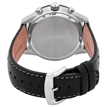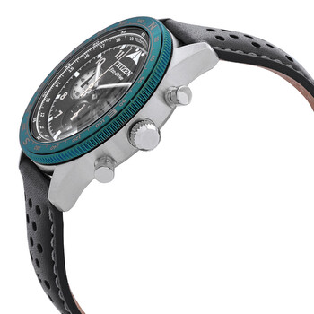 Silver-tone stainless steel case with a black leather strap. Green stainless steel bezel. Black dial with silver-tone hands and index-Arabic numeral hour markers. Minute markers around the outer rim. Dial Type: Analog. Luminescent hands and markers. Date display between 4 and 5 o'clock position. Chronograph - three sub-dials displaying: 60 second, 60 minute and 24 hour. Citizen Caliber Eco-Drive B620 eco-drive movement. Scratch resistant mineral crystal. Solid case back. Round case shape, case size: 43 mm, case thickness: 12.9 mm. Tang clasp. Water resistant at 100 meters / 330 feet. Functions: chronograph, date, hour, minute, second, solar-powered. Sport watch style. Watch label: Japan Movt. Citizen Chronograph Eco-Drive Black Dial Men's Watch CA4558-16E.
