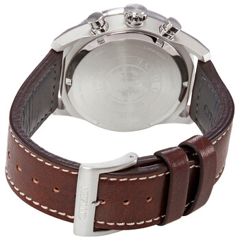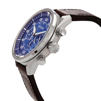 Stainless steel case with a brown leather strap. Fixed stainless steel bezel. Blue dial with luminous silver-tone hands and small Arabic numeral hour markers. Arabic numeral minute markers (at 5 minute intervals). Minute markers around the outer rim. Dial Type: Analog. Luminescent hands. Date display between the 4 and 5 o'clock positions. Chronograph - three sub-dials displaying: 24 hours, 60 minutes and 60 seconds. Citizen caliber B620 eco-drive movement. Scratch resistant mineral crystal. Pull / push crown. Solid case back. Round case shape. Case size: 44 mm. Case thickness: 13 mm. Band width: 21 mm. Tang clasp. Water resistant at 100 meters / 330 feet. Functions: chronograph, date, hour, minute, second. Casual watch style. Citizen Chronograph Eco-Drive Blue Dial Brown Leather Men's Watch CA4210-41L.