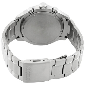 Silver-tone super titanium case and bracelet. Fixed silver-tone super titanium bezel. Blue dial with silver-tone hands and alternating Arabic numeral and index hour markers. Minute markers around the outer rim. Dial Type: Analog. Luminescent hands and markers. Date display at the 3 o'clock position. Chronograph - three sub-dials displaying: 60 second, 60 minute and 24 hour. Citizen Caliber Eco-Drive B612 eco-drive movement. Scratch resistant sapphire crystal. Solid case back. Round case shape, case size: 44 mm, case thickness: 11.6 mm. Fold over clasp with a safety release. Water resistant at 100 meters / 330 feet. Functions: chronograph, date, hour, minute, second, solar-powered. Sport watch style. Watch label: Japan Movt. Citizen Chronograph Eco-Drive Blue Dial Men's Watch CA0810-88L.
